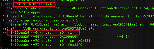 接下來我們要做的就是給0x1063a24 + 0x5b000 = 0x10BEA24 (cmp)這個內存地址添加斷點,然後去修改寄存器r1的值。下方截圖就是給0x10BEA24這個內存址添加了斷點,並且在輸入手機號和密碼後,點擊登錄會執行我們添加的斷點,如下所示。在斷點出我們清楚的看到了cmp r0, r1這行ARM指令。