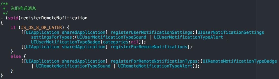 首先是在注冊遠程消息推送,需要注意的是iOS8及以後的系統中注冊方法有所改變(同時證書設置以及push權限也需要開啟)。這一步的目的是,允許app接收遠程消息推送。