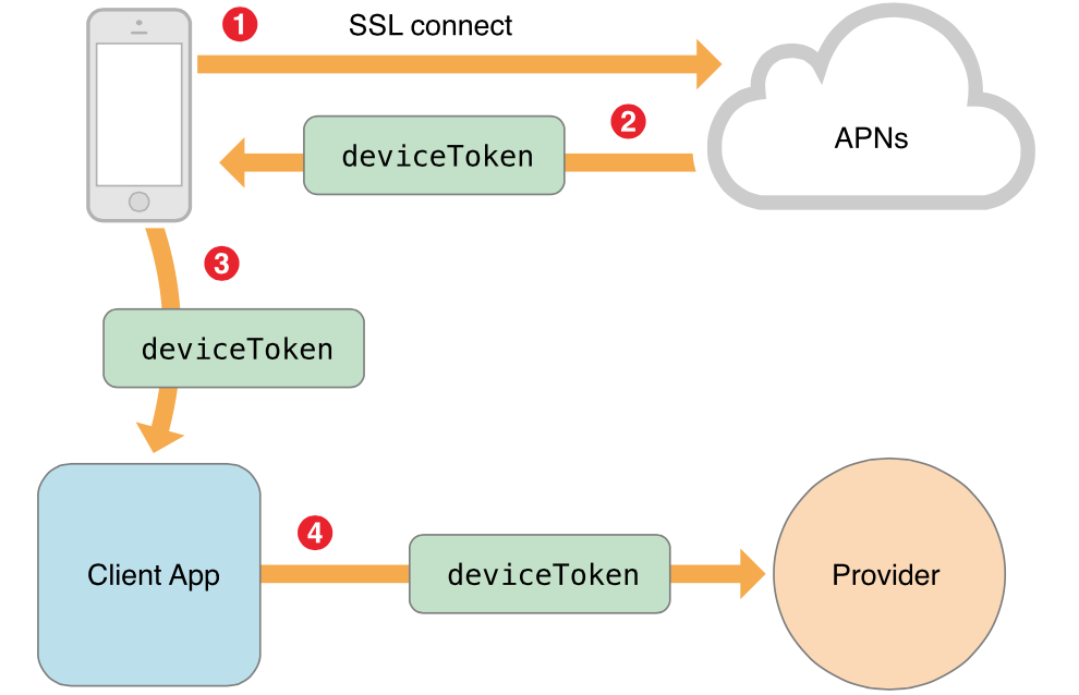 後台服務器以後就是根據deviceToken發送推送消息給APNs,APNs再根據deviceToken將消息推送到對應設備,設備再喚起app,顯示推送而來的消息。