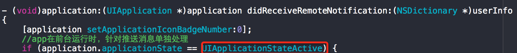 屏幕上會出現通知提醒,如果點開消息進入app,app運行到前台時會調用“didReceiveRemoteNotification”方法,這也就是之前為什麼要區分一下applicationState的原因,因為二者都是通過這一步來處理。