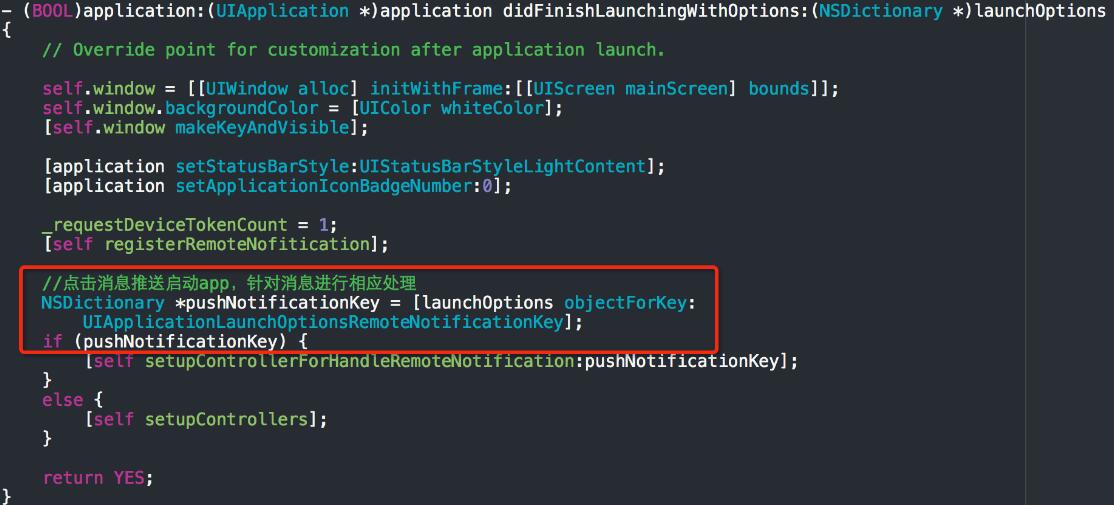 同樣屏幕上出現通知提醒,點開消息進入app,啟動時“didFinishLaunchingWithOptions”方法裡的launchOptions對應UIApplicationLaunchOptionsRemoteNotificationKey部分內容不再為空,含有的即是推送內容,針對處理即可。