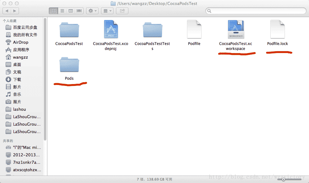 可以看到,工程的根目錄下多了三個東西:CocoaPodsTest.xcworkspace、Podfile.lock文件和Pods目錄。