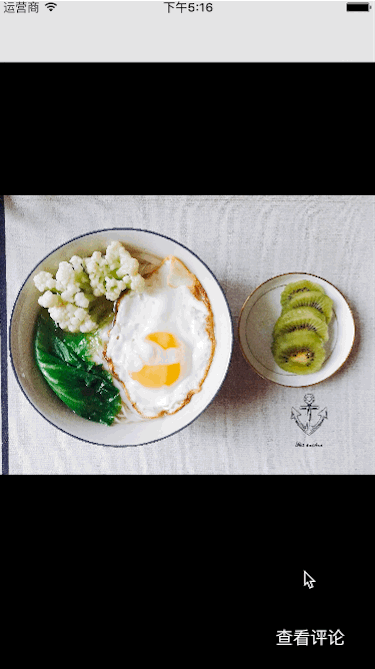 首先我們實現圖片界面,這個界面上有黑色的背景,一張圖片和一個查看評論的按鈕: