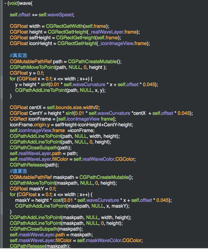 CAShapeLayer *Layer = [CAShapeLayer layer]; Layer.frame = self.bounds; Layer.fillColor = self.realWaveColor.CGColor; Layer...等屬性 [self.view.layer addSublayer:Layer];