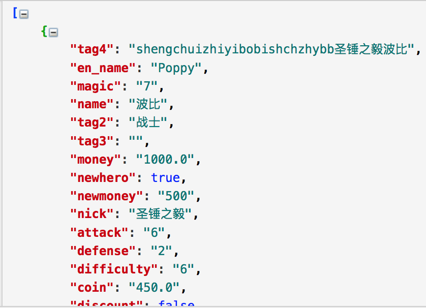 我所使用的數據是英雄聯盟的英雄名單,是一個JSON數據的txt文件, JSON數據的處理代碼如下所示: