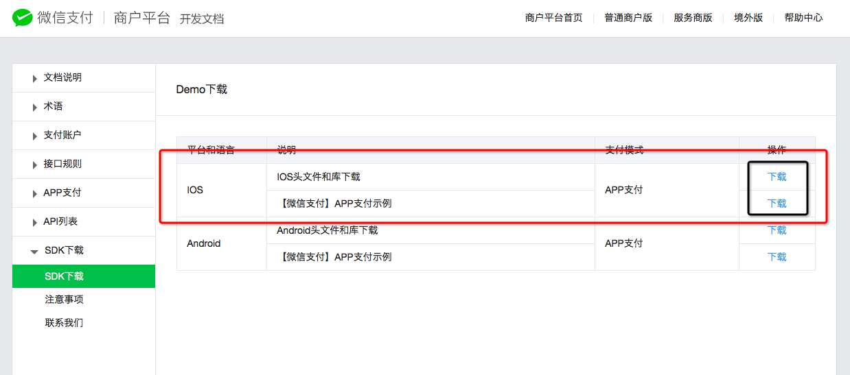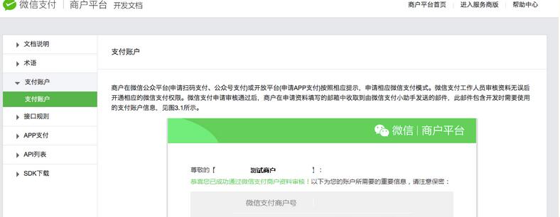 然後可以看到下面的頁面,這個就是微信支付商戶平台的開發文檔,很多東西是可以查閱和了解的,在開發使用微信SDK支付功能的時候,遇到了問題也可以到這找找相關須知信息: