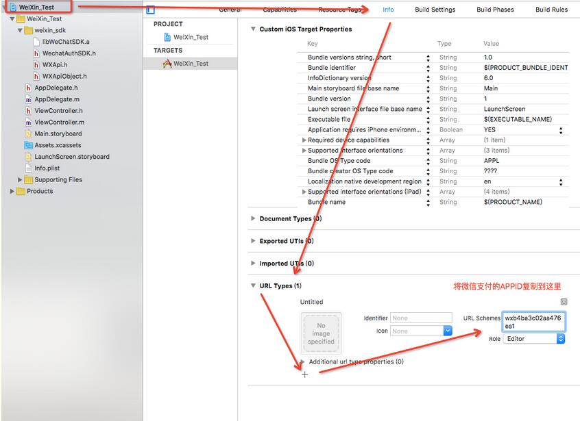 最後還有一個操作哦,將微信支付要用到的APPID設置為URL Schemes [英 skiːm]。