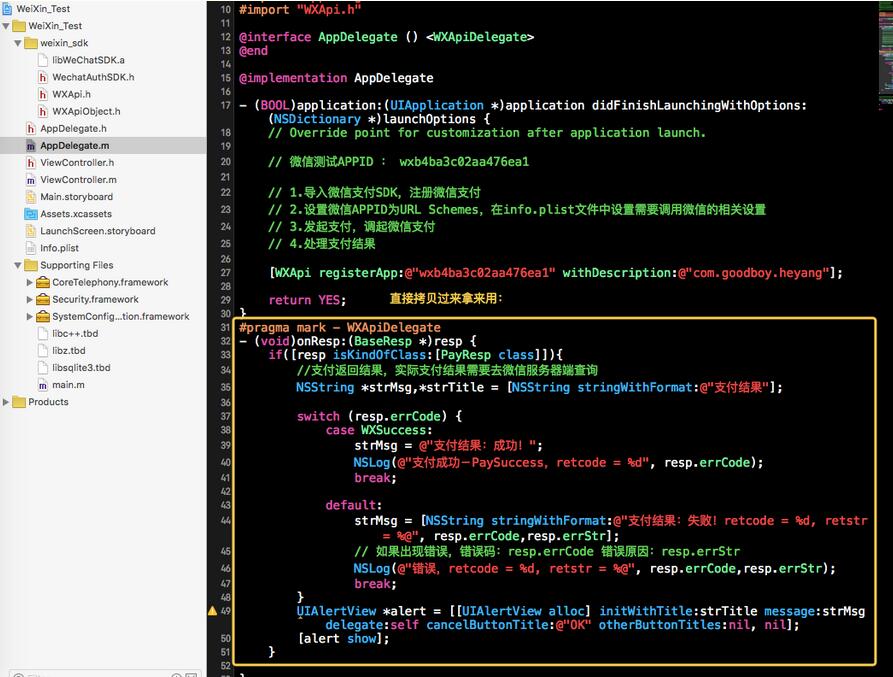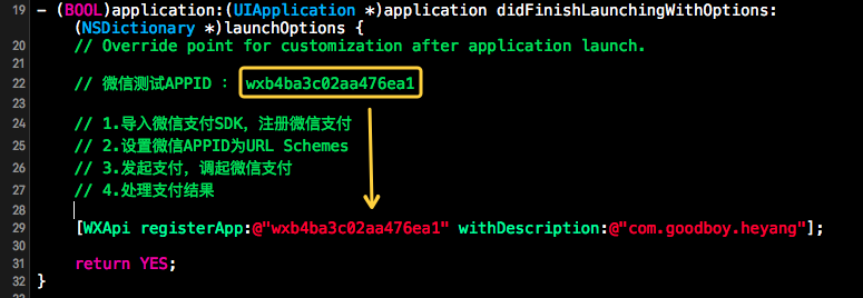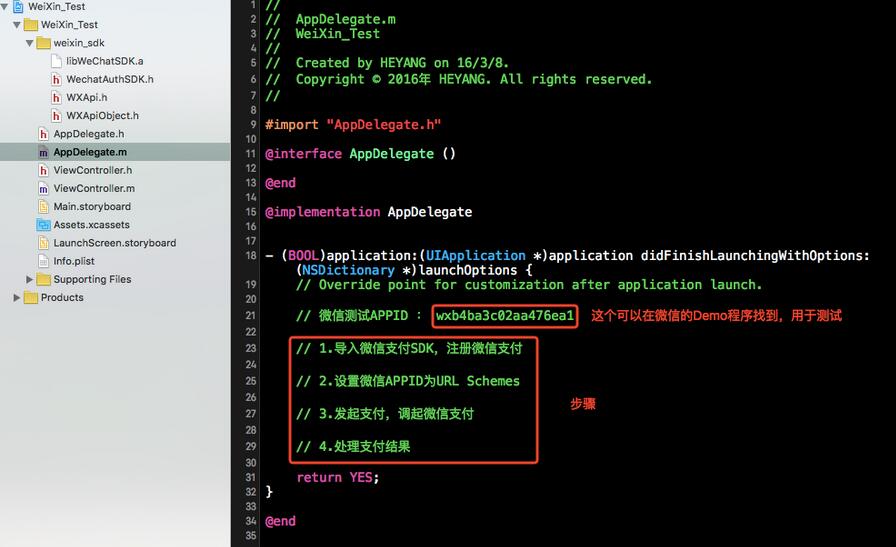 我們可以打開微信支付平台下載的Demo程序,可以在它的AppDelegate的源碼中找到測試用的APPID:
