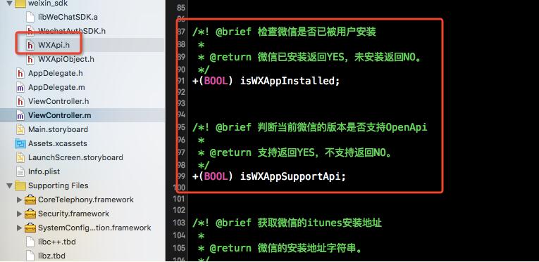 進一步,我們在微信的SDK源碼頭文件中,可以找到兩個很有用的方法,你也可以在微信支付平台打開開發者文檔找到這兩個方法的介紹: