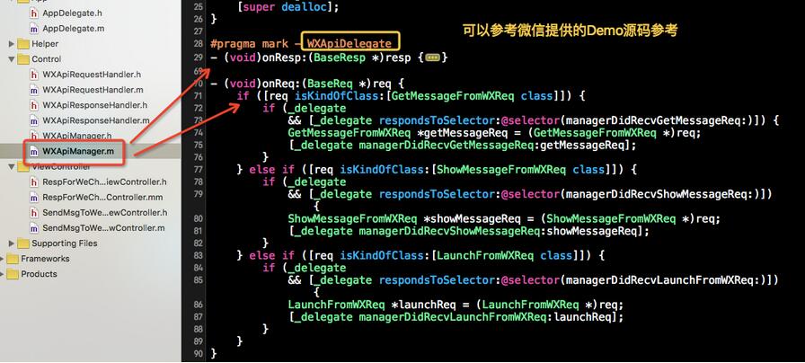 這裡就需要用到微信SDK的處理返回信息的代理協議和代理方法了: