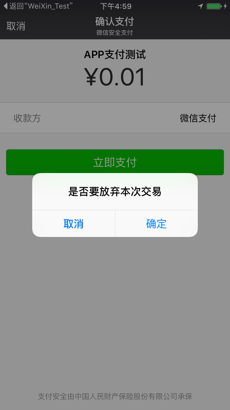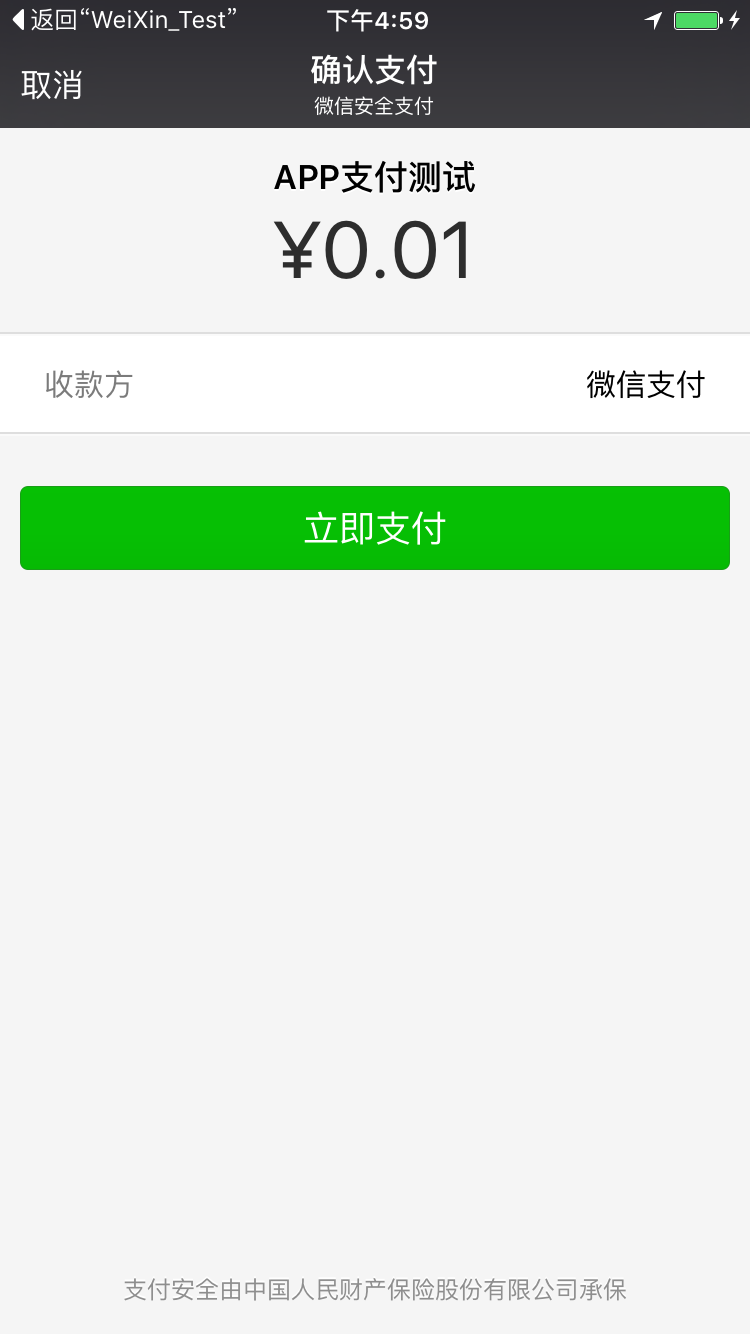 5、到這裡,就完成了整個微信支付的使用流程,下面可以用你的真機進行測試了,因為模擬器不好安裝微信。