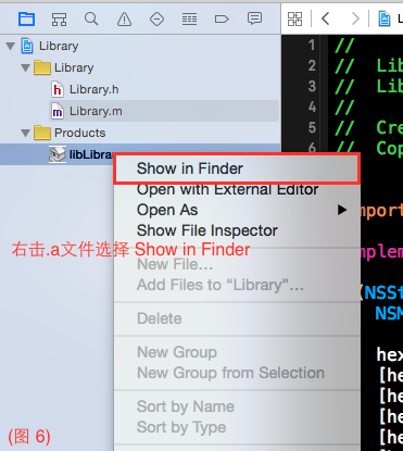 (5)右擊工程目錄下.a文件,查看編譯之後的靜態庫文件如圖6所示, 其中文件Debug-iphoneos裡面包含iPhone真機所需要的libLibrary.a靜態庫文件,文件Debug-iphonesimulator裡面包含的時iPhone模擬器所需要的libLibrary.a靜態庫文件,如圖7所示;