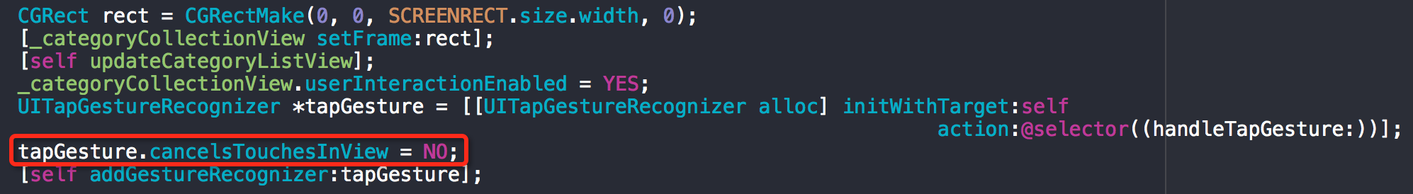 dropDownCategoryListView添加了tap手勢,點擊view則通知controller收起移除下拉分類菜單 ,collectionView作為一部分,點擊collectionView也會通知controller收起移除下拉分類菜單,顯然不符合要求,解決辦法是將手勢的cancelsTouchesInView屬性設為NO,即將touch事件也傳遞到collectionView上,didSelect選中分類後繼續處理即可。