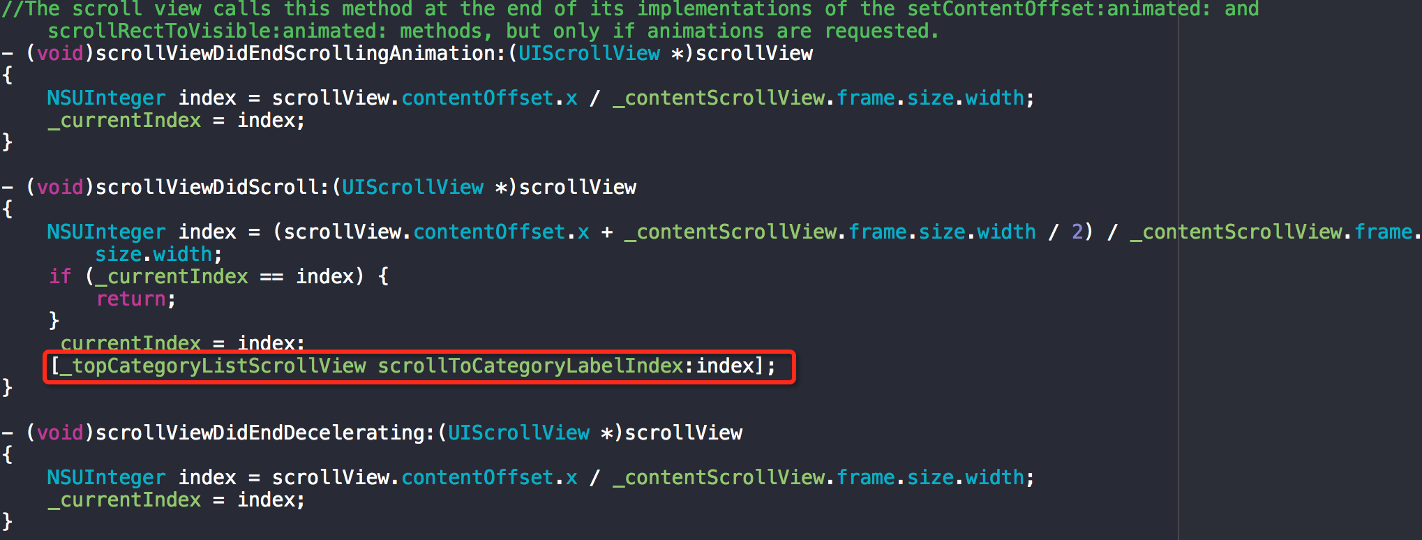 這裡需要說明一下,scrollViewDidEndScrollingAnimation原本是內容視圖滑動結束後調用,用來通知導航欄滑動到對應分類標簽。scrollViewDidEndDecelerating是處理手指在屏幕上滑動內容視圖結束後調用,也是通知導航欄滑動到對應分類標簽。但是為了讓滑動時分類標簽切換顯示效果更更連貫,在scrollViewDidScroll裡進行了處理,當滑出一定距離,新的index與當前index不一致時就通知導航欄切換分類標簽,實際上scrollViewDidEndScrollingAnimation和scrollViewDidEndDecelerating這時已經可以去掉了。