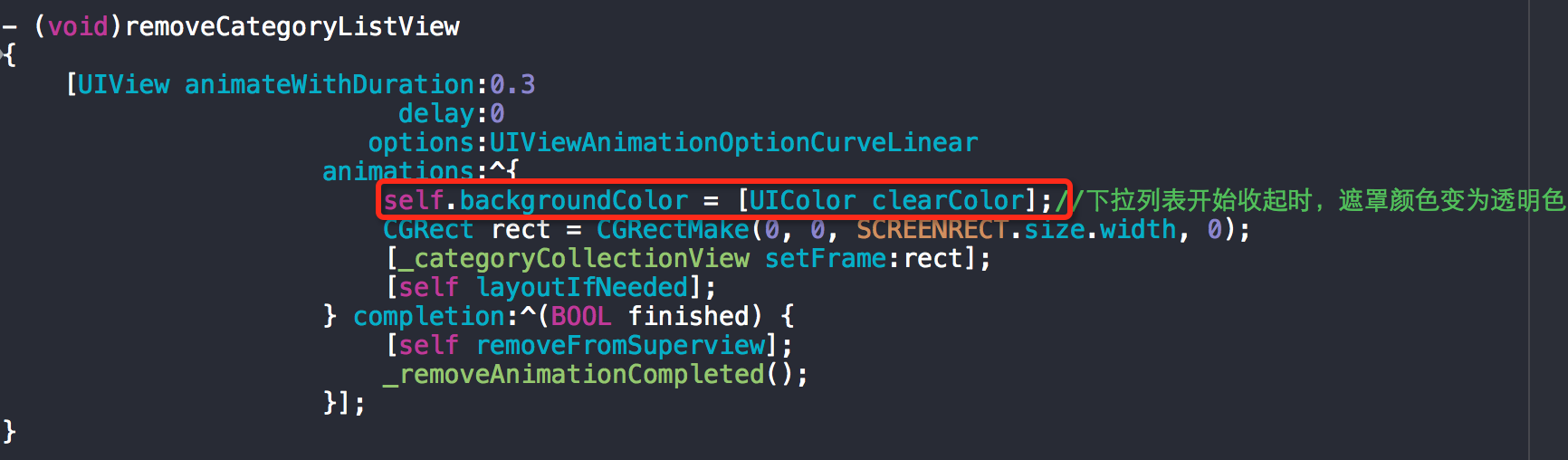 下拉菜單的展開和收起漸變效果用UIView的animation即可,需要注意的是收起動畫效果,需要先去掉陰影,然後收起下拉菜單,這裡的陰影其實就是dropDownCategoryListView設置了一定透明度的背景色,所以先將背景色設成clearColor再收起菜單即可。