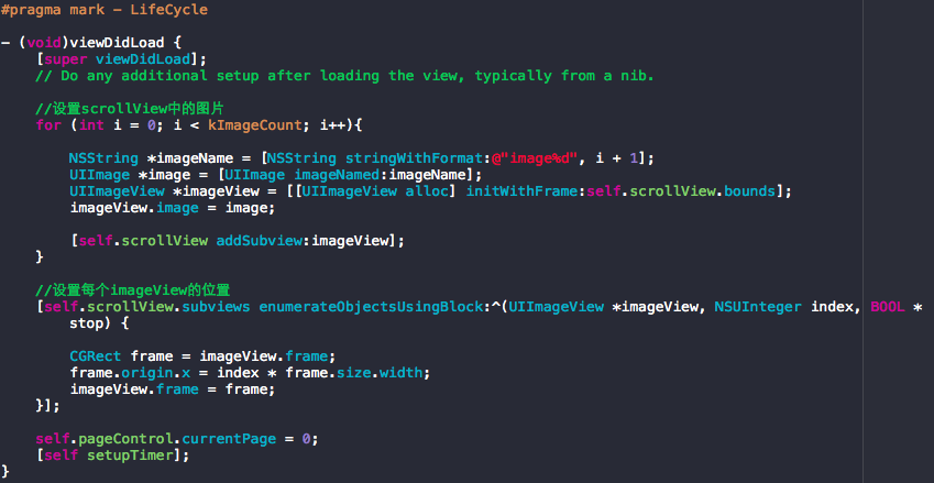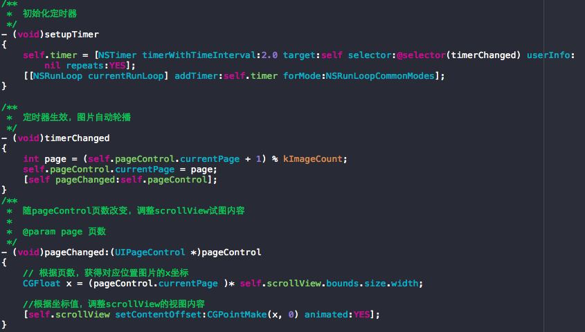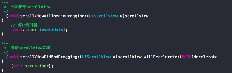 這裡還需要注意的是,由於加入定時器有自動輪播的效果了,會與手動拖拽ScrollView沖突,即手動拖拽ScrollView過程時ScrollView可能自動移動更新圖片了,顯然這種效果是不符合用戶習慣的,這時需要在ScrollView的代理事件中進行處理,即開始拖拽ScrollView時停止定時器,拖拽結束後再開啟定時器。