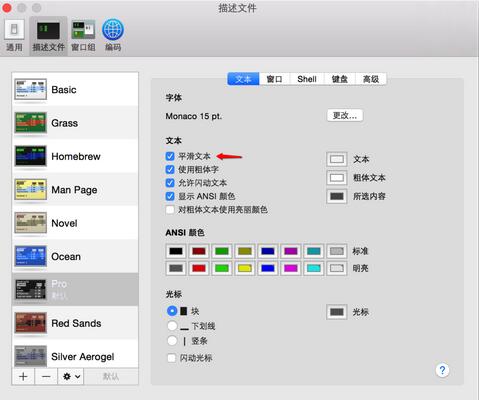 我發現有些人的終端沒有設置“平滑文本”,導致終端上的文字很難看。趕緊把這個選項勾上吧。