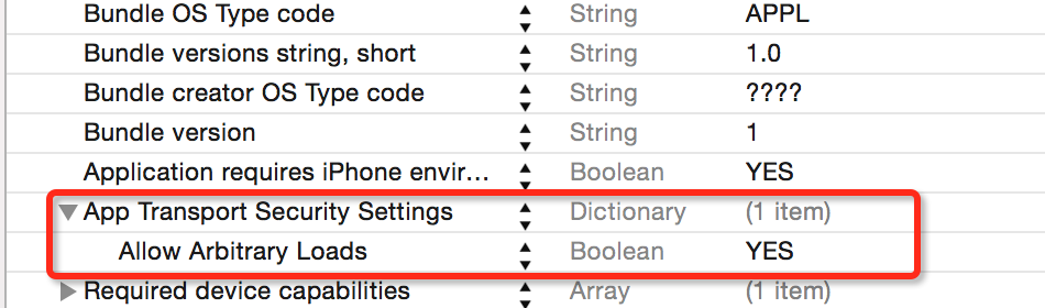 6、iOS9中新增App Transport Security(簡稱ATS)特性, 主要使到原來請求的時候用到的HTTP,都轉向TLS1.2協議進行傳輸。這也意味著所有的HTTP協議都強制使用了HTTPS協議進行傳輸。需要在Info.plist新增一段用於控制ATS的配置: