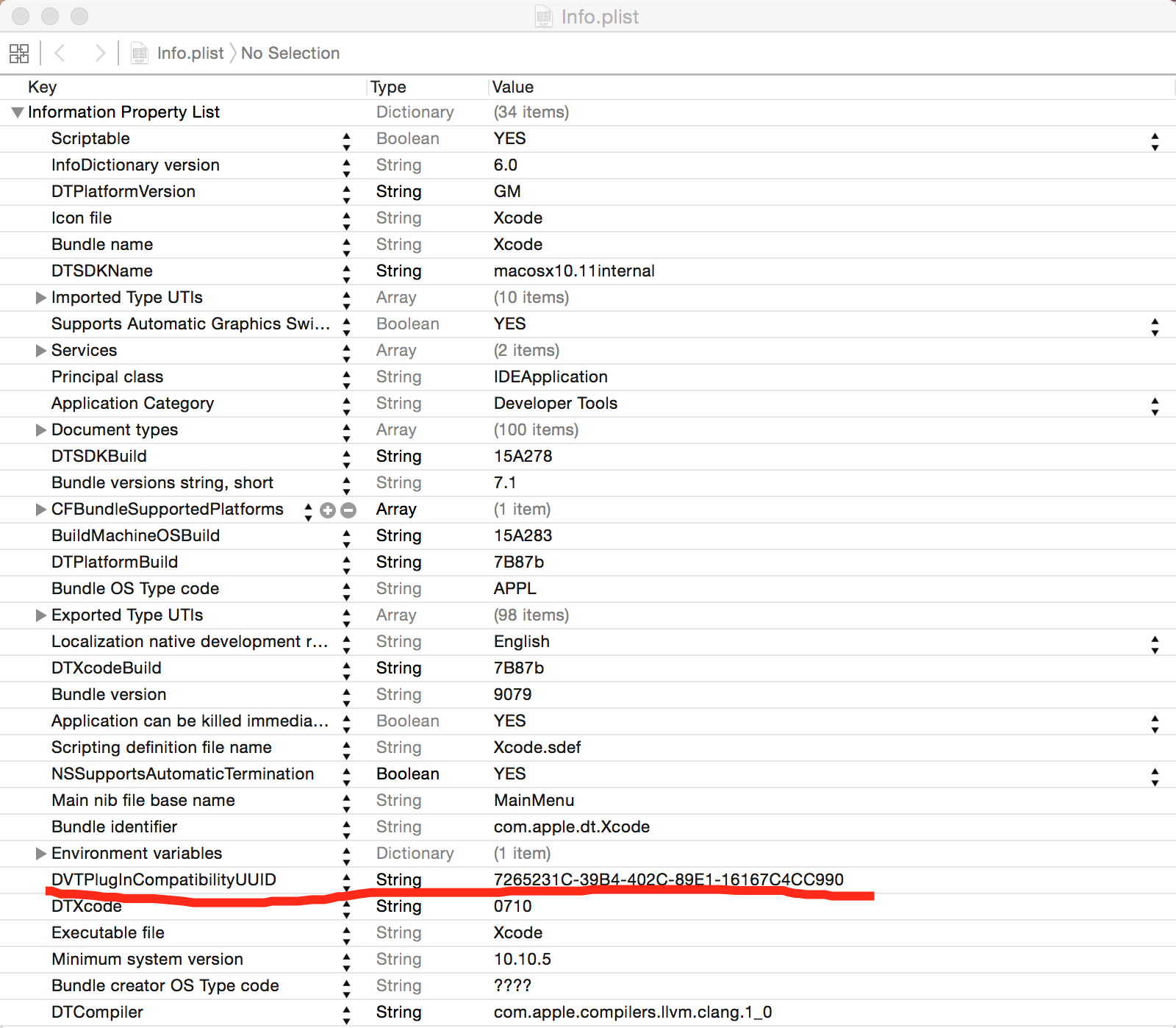 另外一種辦法也能得到Xcode的uuid,在應用程序中找到Xcode,右鍵選擇顯示包內容,找到Info.plist文件打開找到DVTPlugInCompatibilityUUID對應的值就是我們要的uuid