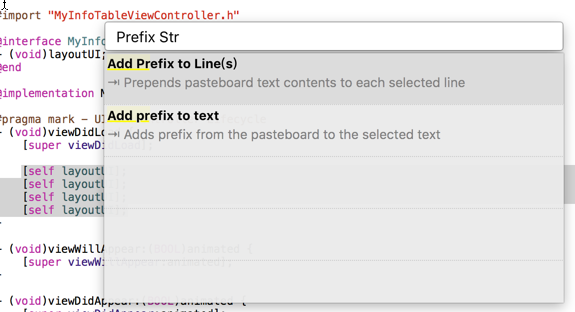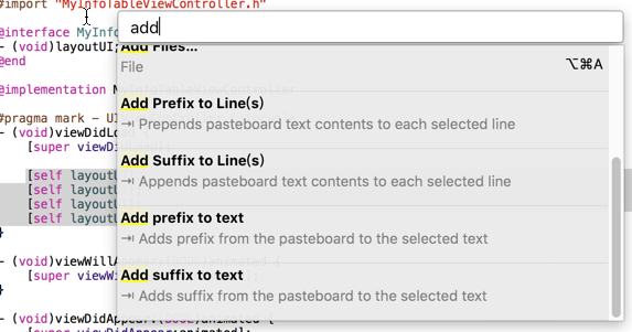 (3)為選中的多行添加前綴或後綴字符串:XCAddPrefixToLinesAction、XCAddSuffixToLinesAction