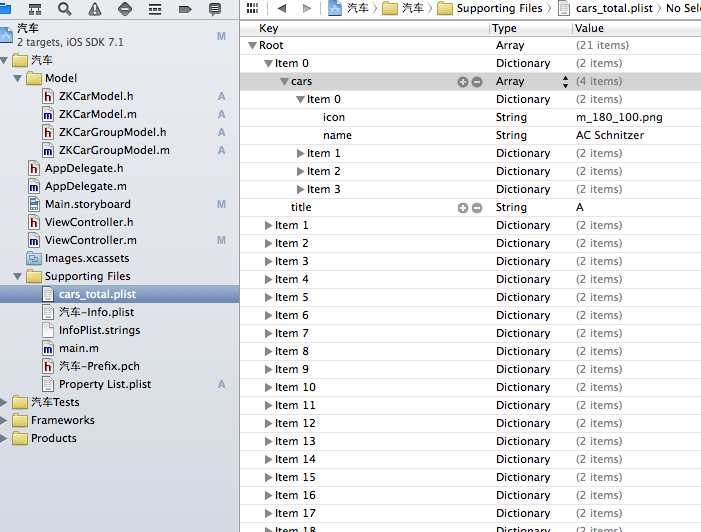 創建的carGroups數組中,而本地的plist文件是一個array類型,而每個array裡面又有一個array數組,所以我們要創建兩個模型類來保存數據,一個模型類保存外面的array數據,一個模型類來保存array裡面的子array數據,然後在模型類裡面創建和plist裡面對應的數據的屬性和方法