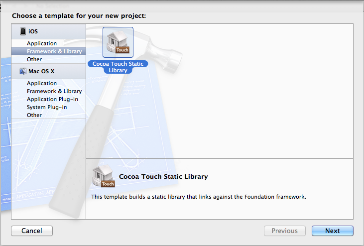Xcode New一個新的project,選擇IOS下面的Framework&Library,下面有一個Cocoa Touch Static Library。直接next去建立一個Print這樣的工程。