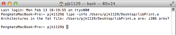 然後打入如下命令:lipo -info /Users/pjk1129/Desktop/libPrint.a