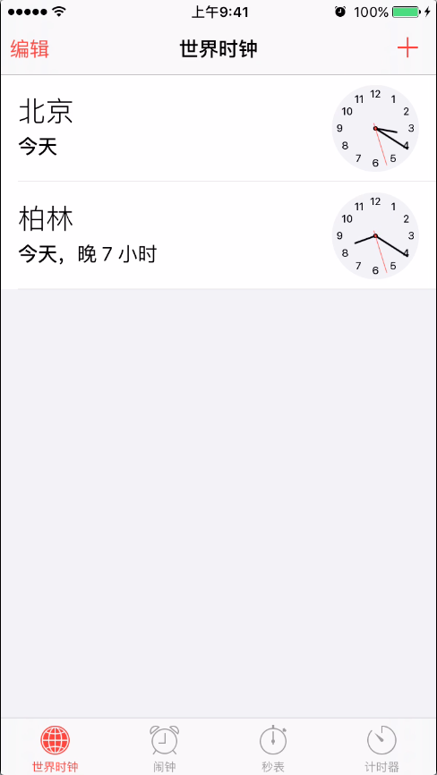 那我們再來看看這個時鐘應用的內部,我們以後做的事情是來開發吧。看看這個官方的應用,我們看看一個應用由什麼來組成。左上角的“編輯”和右上角的“+”號,是不是一個按鈕啊?它可以被點擊的,並且相應事件,是一個按鈕啊。那我們再看中間有“世界時鐘”幾個字吧,這其實就是個字符串對不對。同樣地道理,下面“北京”、“今天”、“柏林”等等這些東西都只是一些字符串吧。那在我們UI階段,有專門放置字符串的控件,讓他能夠放到這個界面上面。每一個時鐘,其實是個圖片,我們也有專門的控件來放圖片。那最底下那些東西,其實也是一些按鈕了吧。所以我們可以看到,做一個軟件還是很簡單的啊。