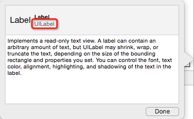 我們再次看到右下方的資源庫中,單擊這個Label控件,我們可以看到旁邊出現了一個對話框。那紅色框起來的地方,UILabel是這個控件的類,代表什麼,他是一個UILabel類控件吧,記住它,對以後代碼編程的時候會很有用。