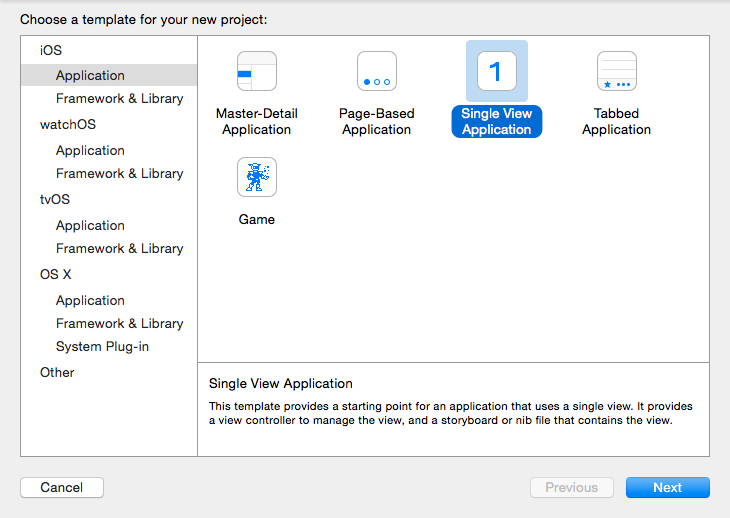 還是像以前一樣,我們開始新建一個工程,但是!我們不再是選OS X裡面的命令行工程了,而是像上面顯示的,我們找到iOS這個選項,選擇他下面的Application,那我們就會看到有上面幾個選項,第一個是在iPad上面會用到的,他有一個側邊欄可以選擇。第二個是一個有分頁效果的頁面,可以左右滑動。第三個是單個頁面的應用。第四個是帶有一個標簽欄,就像上面我們看的時鐘應用,下面的按鈕可以跳轉到不同的一個頁面。那最後一個就是Game,我就不說了。在我們學習過程中,使用最多的是第三個,也是我選中的Single View Application。