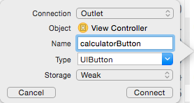 第一行Connection中有三個選項,第一個是默認的Outlet,這個中文就是出口的意思。可以想象我們有一個管道,讓我們把東西從樓上運到樓下,那我們在管道的出口處等著拿東西就可以了吧~同樣,想要獲取到這個控件的信息,信息就從樓上運過來,我們找到這個管道的出口,是不是就可以拿到控件信息了,通過這個我們可以拿到控件屬性。第二個是Action,動作,使用這個會產生一個新的方法,在響應用戶交互時,會執行方法中的代碼。第三個Outlet Collection,顧名思義一個屬性的集合。這裡我們選擇Outlet。第二行的對象所屬,是個不可選擇的。第三行Name,要我們為這個屬性或者這個方法取一個別名,這裡取名calculatorButton。第四行Type中,是我們這個對象的類型,之前拖拽控件的時候我們就看到了,這裡會是UIButton。最後的Storage,持有類型,這個控件在拖到storyboard上面的時候,就被這個視圖有一個Strong持有,保證它存在於堆中,所以在外部,我們不需要一個Strong指針指向它。如果這個控件從視圖中離開,那麼,他就會被從堆中清除,這個指向控件的指針就會變為我們想要的nil,因為向nil發送一個消息,程序是不會崩潰的。大部分情況下,這裡都是使用Weak。最後按下Connect按鈕或者敲下回車。
