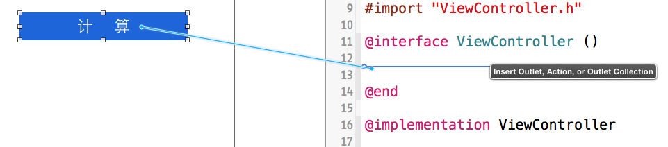 ,我們發現有了兩個可以操作的開發界面,一個是顯示的storyboard,一個顯示的是代碼。那這個有什麼用呢?現在,按住你電腦上的control按鈕,不要放手,用鼠標按住storyboard區中的“計算”按鈕,向代碼區拖動,有沒有發現多出了一根藍色的線,我們一直將鼠標移動到類擴展區域,看到代碼區多了一根橫線,這時,松開鼠標和鍵盤就行。