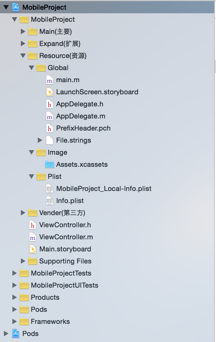 2.3.1 Global用於存放項目一些全局的內容,包含啟動項的內容LaunchScreen.storyboard、頭部引用PrefixHeader.pch、語言包File.strings