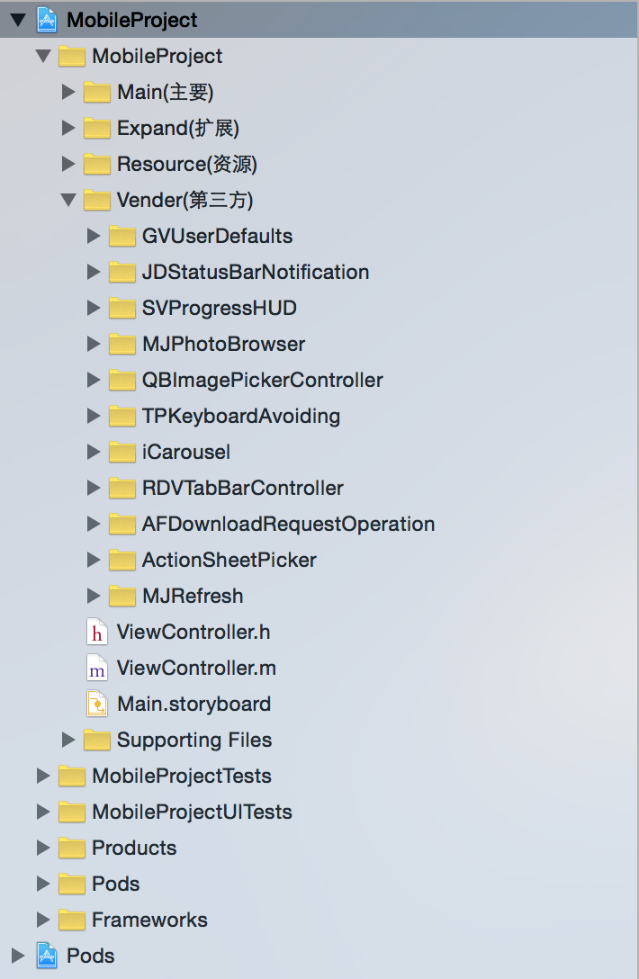 雖然項目中已經用Pod來管理第三方插件,但對於一些可能要進行修改的第三方可以存放在這邊,本實例中引用的幾個比較常用的第三方插件,簡單介紹其中的幾個,GVUserDefaults是對UserDefaults的封裝,簡單就可以用於存取操作;JDStatusBarNotification是在狀態欄提示效果的插件;ActionSheetPicker底部彈出如時間選擇、選項的插件;QBImagePickerController是照片選擇插件,支持多選並可以設置最多選擇張數;