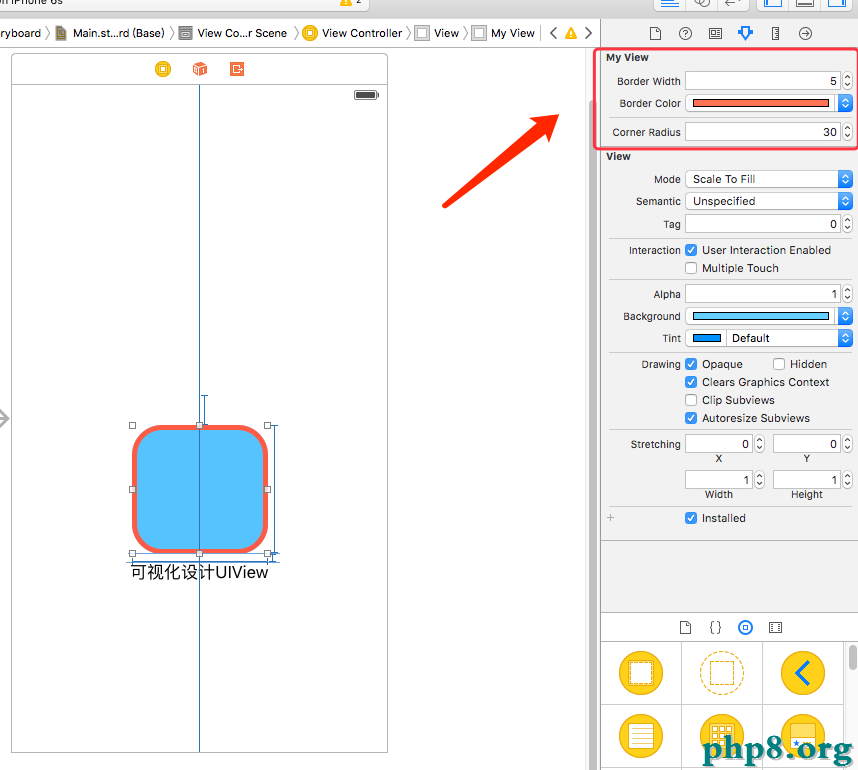 上面為設計界面,能夠直接顯示一個View的圓角與邊框線