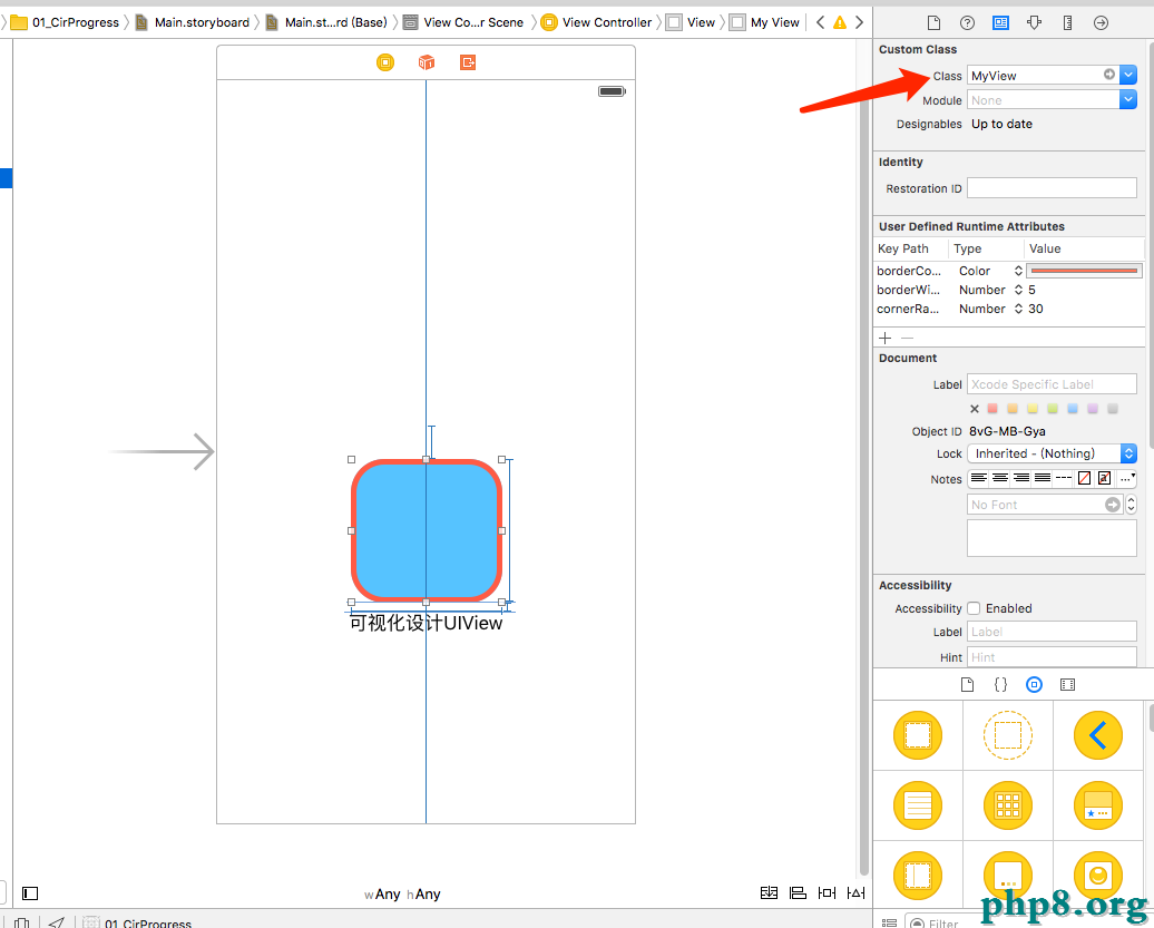 3、在storeboad中添加一個view,並且設置這個view的類為 我們剛才創建的 MyView