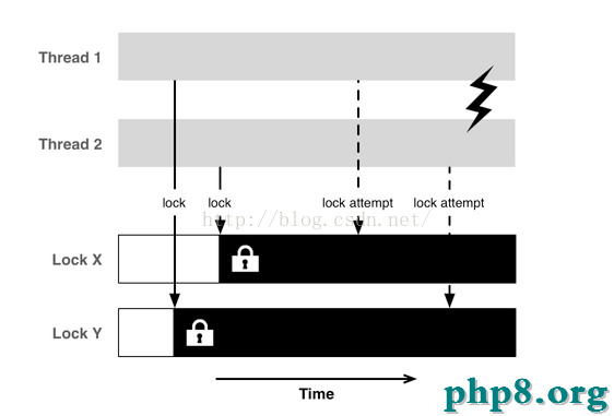 上圖是一張描述一個簡單的死鎖模型的圖,首先Thread1鎖定占有資源Y,Thread2鎖定占有資源X,但同時相互向對方請求資源,因此都無法釋放自身資源去訪問下一個資源,結果兩個線程相互阻塞。