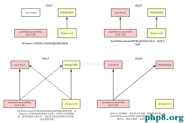 因此只要讓同步下載時不會掛起主線程就可以避免線程死鎖的情況發生。因此項目中使用NSURLConnet的同步請求方法實現下載即可, 因為它不會掛起主線程,還能讓其他線程往主線程中添加代碼塊block。