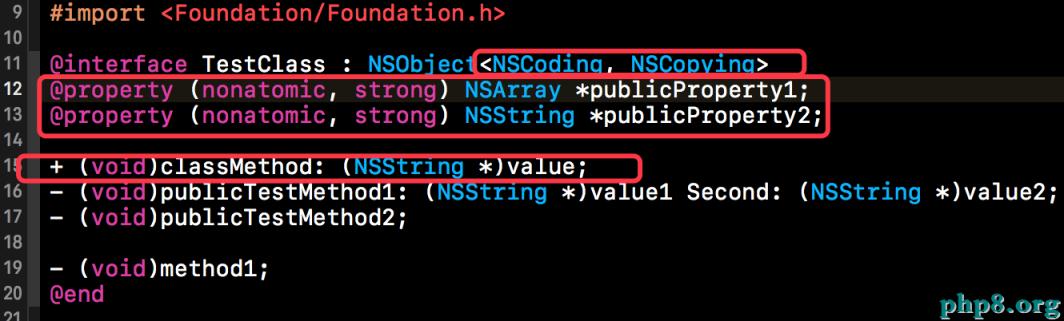 下方這幾個截圖就是我們的測試類TestClass的主要部分,因為TestClass是專門用來測試的類,所以其涉及的內容要盡量的全面。TestClass遵循了NSCoding, NSCopying這兩個協議,並且為其添加了公有屬性、私有屬性、私有成員變量、 公有實例方法、私有實例方法、類方法等。這些添加的內容,都將是我們Runtime的操作對象。下方那幾個TestClass的類目稍後在使用Runtime時再進行介紹。