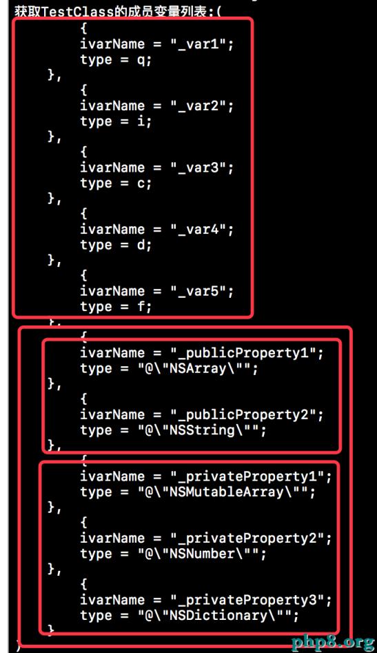 下方就是調用上述方法獲取的TestClass類的成員變量。當然在運行時就沒有什麼私有和公有之分了,只要是成員變量就可以獲取到。在OC中的給類添加成員屬性其實就是添加了一個成員變量和getter以及setter方法。所以獲取的成員列表中肯定帶有成員屬性,不過成員屬性的名稱前方添加了下劃線來與成員屬性進行區分。我們也可以獲取成員變量的類型,下方的_var1是NSInteger類型,動態獲取到的是q字母,其實是NSInteger的符號。而i就表示int類型,c表示Bool類型,d表示double類型,f則就表示float類型。當然這些基本類型都是由一個字母代替的,如果是引用類型的話,則直接就是一個字符串了,比如NSArray類型就是"@NSArray"。