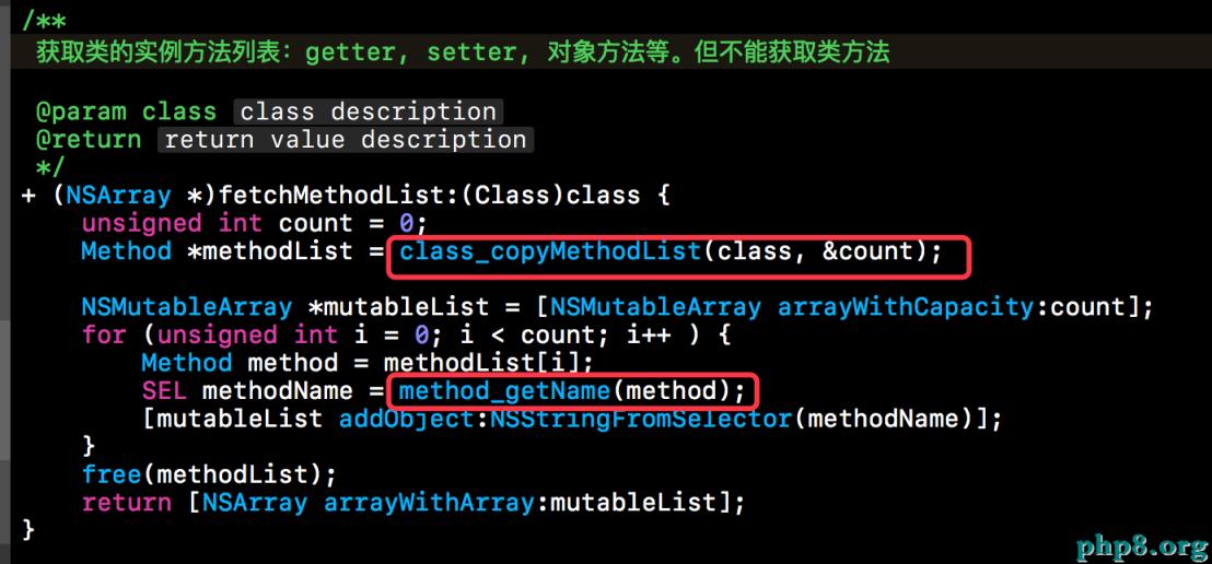 接下來我們就來封裝一下獲取類的實例方法列表的功能,下方這個+fetchMethodList:就是我們封裝的獲取類的實例方法列表的函數。在下方函數中,通過class_copyMethodList()方法獲取類的實例方法列表,然後通過for循環使用method_getName()來獲取每個方法的名稱,然後將方法的名稱轉換成NSString類型,存儲到數組中一並返回。具體代碼如下所示: