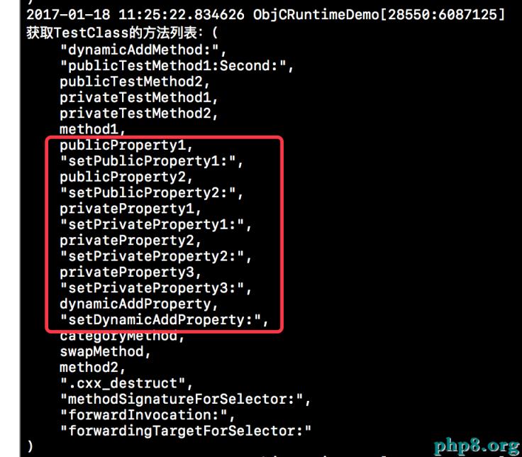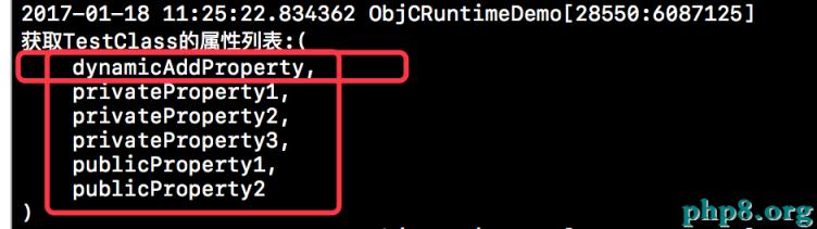 下方這個截圖就是調用上述方法獲取的TestClass的所有的屬性,當然dynamicAddProperty是我們使用Runtime動態給TestClass添加的,所以也是可以獲取到的。當然我們獲取到的屬性的名稱為了與其對應的成員變量進行區分,成員屬性的名字前邊是沒有下劃線的。