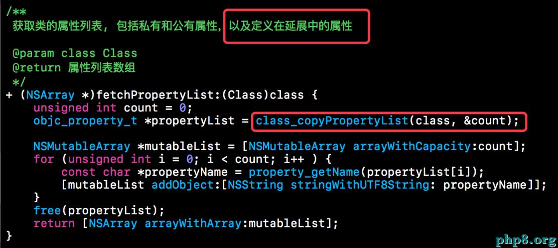 上面獲取的是類的成員變量,那麼下方這個+fetchPropertyList:獲取的就是成員屬性。當然此刻獲取的只包括成員屬性,也就是那些有setter或者getter方法的成員變量。下方主要是使用了class_copyPropertyList(Class,&count)來獲取的屬性列表,然後通過for循環通過property_getName()來獲取每個屬性的名字。當然使用property_getName()獲取到的名字依然是C語言的char類型的指針,所以我們還需要將其轉換成NSString類型,然後放到數組中一並返回。如下所示:
