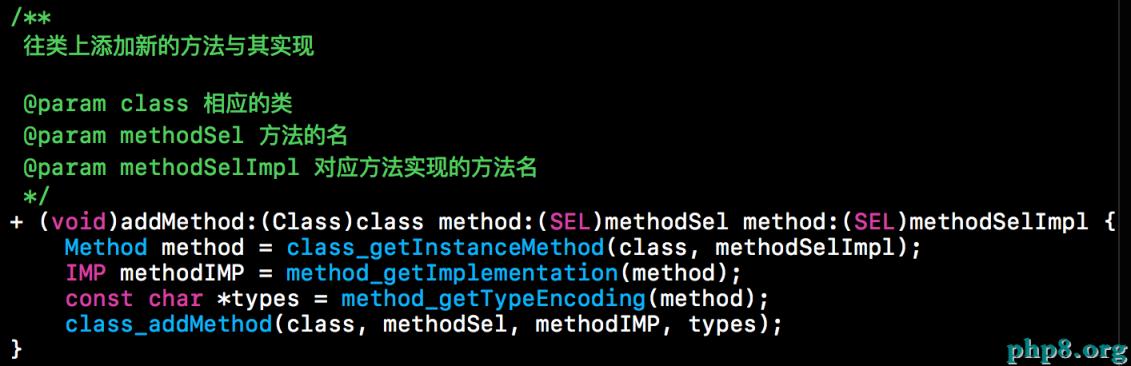 下方就是動態的往相應類上添加方法以及實現。下方的+addMethod方法有三個參數,第一個參數是要添加方法的類,第二個參數是方法的SEL,第三個參數則是提供方法實現的SEL。稍後在消息發送和消息轉發時會用到下方的方法。下方主要是使用class_getInstanceMethod()和method_getImplementation()這兩個方法相結合獲取相應SEL的方法實現。下方的IMP其實就是Implementation的方法縮寫,獲取到相應的方法實現後,然後再調用class_addMethod()方法將IMP與SEL進行綁定即可。具體做法如下所示。