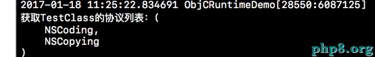 下方是獲取我們類所遵循協議列表的方法,主要使用了class_copyProtocolList()來獲取列表,然後通過for循序使用protocol_getName()來獲取協議的名稱,最後將其轉換成NSString類型放入數組中返回即可。