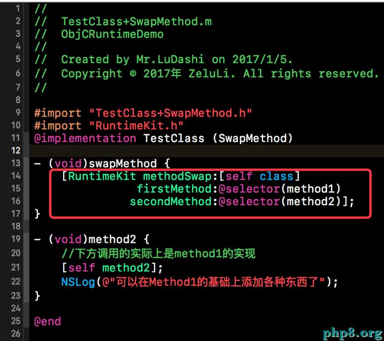 下方這段代碼就是對上述方法的測試。下方是TestClass的一個類目,在該類目中將類目中的方法與TestClass中的方法進行了替換。也就是將method1與method2進行了替換,替換後在method2中調用的method2其實就是調用的method1。在第三方庫中,經常會使用該特性,已達到AOP編程的目的。