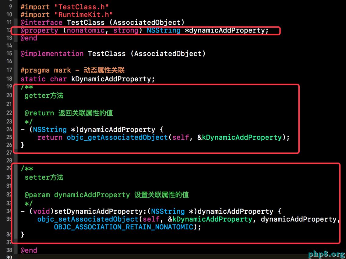 屬性關聯說白了就是在類目中動態的為我們的類添加相應的屬性,如果看過之前發布的對Masonry框架源碼解析的博客的話,對下方的屬性關聯並不陌生。在Masonry框架中就利用Runtime的屬性關聯在UIView的類目中給UIView添加了一個約束數組,用來記錄添加在當前View上的所有約束。下方就是在TestClass的類目中通過objc_getAssociatedObject()和objc_setAssociatedObject()兩個方法為TestClass類添加了一個dynamicAddProperty屬性。上面我們獲取到的屬性列表中就含有該動態添加的成員屬性。