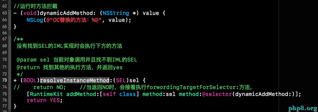 當在相應的類以及父類中找不到類方法實現時會執行+resolveInstanceMethod:這個類方法。該方法如果在類中不被重寫的話,默認返回NO。如果返回NO就表明不做任何處理,走下一步。如果返回YES的話,就說明在該方法中對這個找不到實現的方法進行了處理。在該方法中,我們可以為找不到實現的SEL動態的添加一個方法實現,添加完畢後,就會執行我們添加的方法實現。這樣,當一個類調用不存在的方法時,就不會崩潰了。具體做法如下所示: