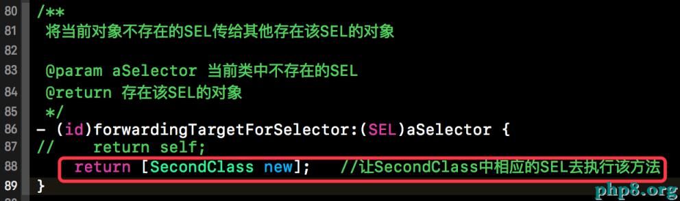 如果不對上述消息進行處理的話,也就是+resolveInstanceMethod:返回NO時,會走下一步消息轉發,即-forwardingTargetForSelector:。該方法會返回一個類的對象,這個類的對象有SEL對應的實現,當調用這個找不到的方法時,就會被轉發到SecondClass中去進行處理。這也就是所謂的消息轉發。當該方法返回self或者nil, 說明不對相應的方法進行轉發,那麼就該走下一步了。