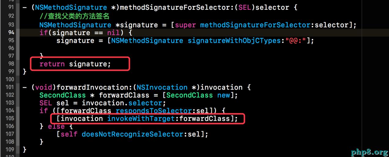 在+resolveInstanceMethod:返回NO時就會執行下方的方法,下方也是講該方法轉發給SecondClass,如下所示: